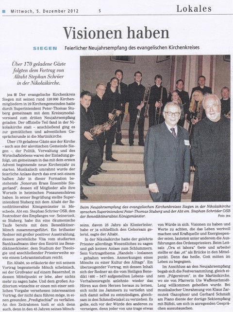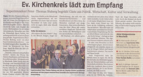 Über 170 Gäste aus Politik, Justiz, Wirtschaft und Verwaltung hatte der Superintendent des Kirchenkreises Siegen zu Beginn des neuen Kirchenjahres in die Nikolaikirche geladen. Das Sonorum Brass Ensemble umrahmte dabei musikalisch den Vortrag von Benediktiner-Altabt Stephan Schröer aus Meschede.