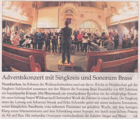 Vor über 500 begeisterten Zuschauern gestaltete das Sonorum Brass Ensemble gemeinsam mit dem Evangelischen Singkreis Salchendorf ein Adventskonzert im Rahmen des Neunkirchener Weihnachtsmarktes.