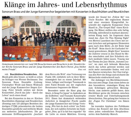 Über 500 Zuhörer genossen in Buschhütten und Neunkirchen eine musikalische Reise durch das Jahr, die mit dem obligatorischen Radetzky-Marsch beendet wurde. Es war ein tolles Projekt mit dem Jungen Kammerchor Siegen, von dem es sicherlich noch eine Neuauflage geben wird.