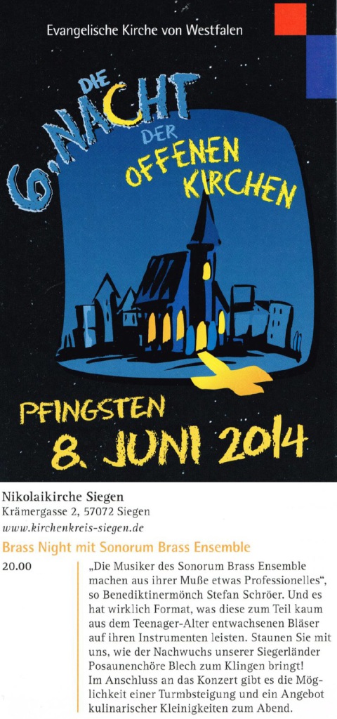 Zum ersten Mal war das Sonorum Brass Ensemble im nördlichen Siegerland zu Gast. Den ca. 100 Gottesdienstbesuchern wurden Stücke von Barock bis zeitgenössischer Musik von Chris Hazell präsentiert.